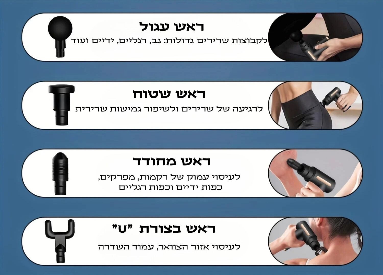 4 ראשי עיסוי מתחלפים, כל אחד יכול למצוא את המגע המושלם: הראש העגול להרגעה כללית, ראש ה-"מזלג" לצדי הצוואר והשדרה, הראש השטוח לאזורים רחבים כמו גב וירכיים, וראש הקליע לנקודות עמוקות במיוחד. פשוט מחליפים ראשים, בוחרים את עוצמת הרטט מבין כמה דרגות מהירות, ונוגעים בשמיים של שחרור שרירי!
